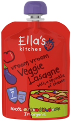 Organic tomatoes 23%, Organic vegetable stock 19% (water and organic vegetables: carrots, parsnips, swedes, onions and leeks), Organic carrots 13%, Organic courgettes 11%, Organic onions 10%, Organic aubergines 6%, Organic red peppers 6%, Organic pasta 5%, (durum wheat and egg whites*), Organic mozzarella cheese (milk) 4%, Organic creme fraiche (milk) 2%, Organic garlic 1%, Organic mixed herbs <1% (basil, oregano), Other stuff 0%